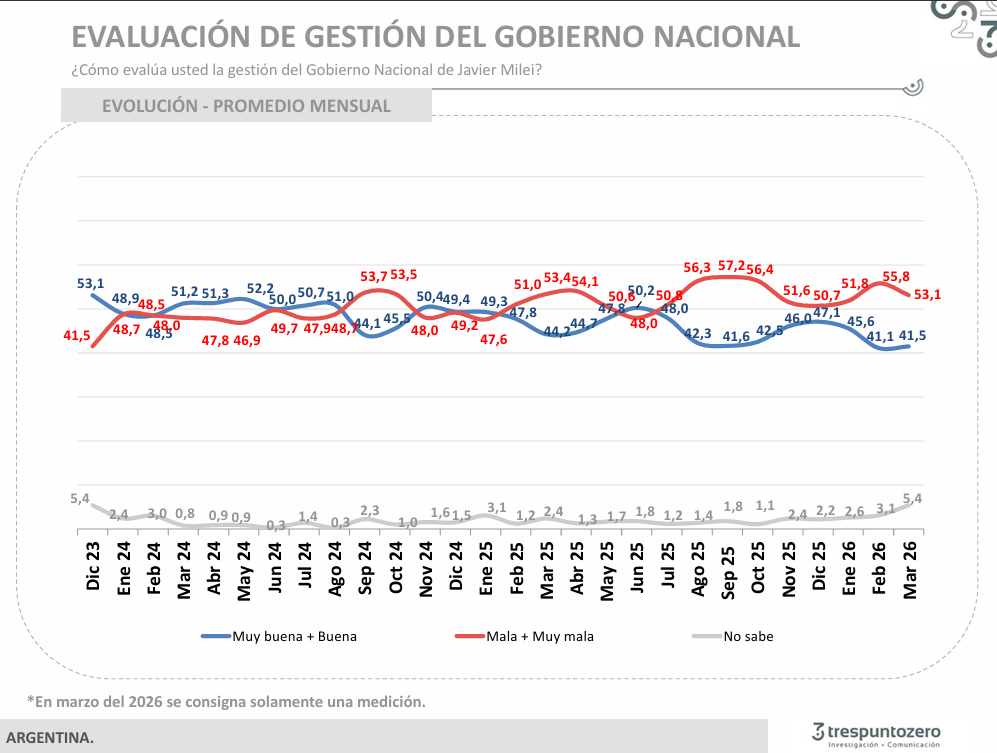 Hubo, hasta acá, un patrón: la imagen de Milei caía, pero ante un elemento de impacto recuperaba rápidamente lo perdido. Esa tendencia todavía no se dio en 2026 -a pesar que, por caso, tuvo triunfos legislativos- y, según un estudio de Shila Vilker de TresPuntoZero, la tendencia marca que Milei pierde elasticidad, las caídas son más largas y más profundas, y les cuesta más recuperarse. ¿Habrá un rebote, como hubo en otros momentos críticos, por ejemplo en septiembre de 2025?