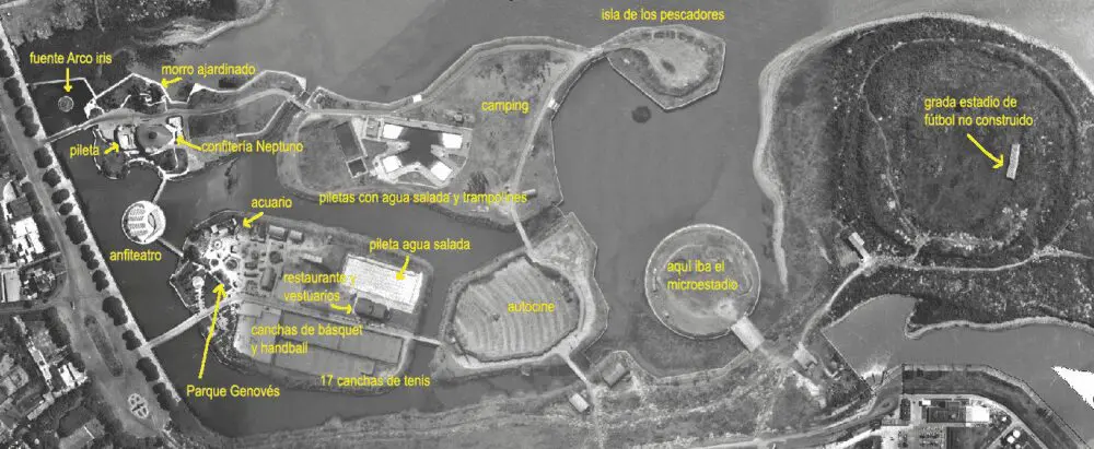 La ciudad deportiva, según la ley, debía ser beneficiosa para toda la ciudadanía en consonancia con el Estado de Bienestar sin peronismo que quería impulsar Illia y la dictadura que lo derrocó años después. Por eso, el desarrollo incluía un camping frente al río, un anfiteatro, piletas de agua salada, un autocine y hasta un parque de diversiones. Casi todas esas instalaciones funcionaron durante varios años, aunque el estadio nunca fue construido y sólo se llegó a levantar una grada.
