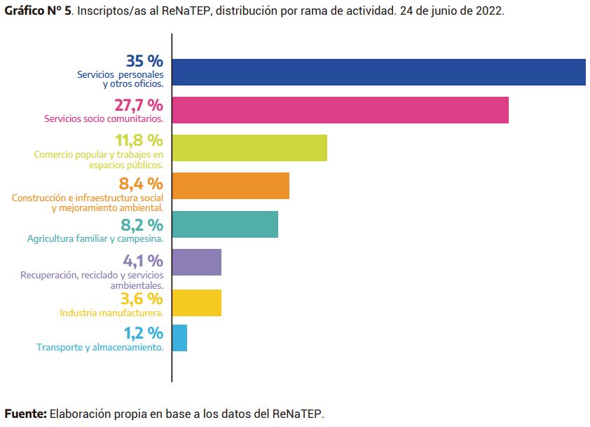 Todas tienen algo en común: valor comercial. Sin embargo, la EP no termina ahí. Según el Registro Nacional de Trabajadores de la Economía Popular (ReNaTEP), en junio de 2022, el 27,7% de los inscriptos realizaban tareas vinculadas a servicios socio comunitarios. De estos, el 64,8% estaban ocupados en comedores y merenderos comunitarios.