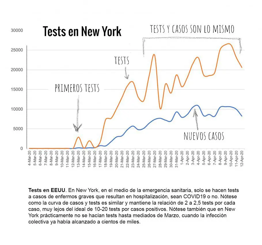 En una situación de epidemia controlada, un número de 10 tests por enfermo detectado indicaría que la enfermedad está relativamente bajo control, se testearon a 10 posibles infectados, solo 1 tiene COVID-19. En lugares donde la situación no está bajo control, como Nueva York, ese número da entre 2 y 2,5 tests por enfermos ( se hacen 20.000-25.000 tests por día, pero hay 10.000 enfermos diarios), indicando que el sistema solo da abasto para confirmar enfermos en el hospital: por cada 2 que van al hospital, 1 tiene COVID-19. En Argentina se están haciendo unos 1000 tests por día con menos de 100 casos nuevos cada día. Si se compararan estas dos situaciones «por habitante», en Nueva York (o inclusive en todo Estados Unidos) hoy se hacen más «tests por millón de habitantes» que en Argentina. El dato no refleja la situación de los dos lugares y es por lo tanto un dato inútil.