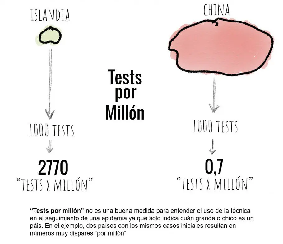 El reclamo de «tests masivos» va muchas veces acompañado de la crítica por lo que se hace basada en la comparación entre países de «tests por millón de habitantes» («¡Tengamos al menos los mismos tests por millón que Perú!»). Ya dijimos antes que las comparaciones entre países son complejas y en general poco informativas, pero esta idea en particular es una zoncera, como lo es analizar cualquier indicador de una epidemia por millón de habitantes que en principio solo dice cuán grande o chico es un país. Las epidemias empiezan igual en todos lados, con un puñado de infectados, más allá de la población total. Los 100 primeros infectados en Islandia desencadenaron la misma progresión de contagios que si vivieran en China. Los primeros 100 infectados en China no infectaron más porque hay más chinos. Es muy simple ver la inutilidad de este número. En todo caso, no es importante cuántos tests por habitantes se hace sino cuántos tests por enfermos se hace.