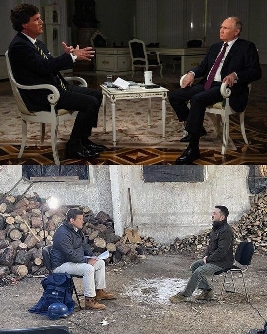 Si la guerra en Ucrania es una película en desarrollo, dos fotogramas son una metáfora del momento actual del conflicto. Ambos fueron registrados en la previa del 24 de febrero durante entrevistas a presentadores estadounidenses (retengan ese dato); en uno vimos al mandatario ruso, Vladímir Putin, de traje, sentado con la espalda apoyada en el respaldo acolchado de un sillón individual, desde una calefaccionada sala del Kremlin junto a Tucker Carlson; en el otro, está su par ucraniano, Volodímir Zelenski, con su clásica ropa de fajina, apenas sentado al borde de una silla de patas metálica, en un edificio semidestruido “cerca de las líneas del frente en Járkov”, y con fuego en latas detrás de las cámaras de Fox News. Pero dos fotogramas no hacen una película.
