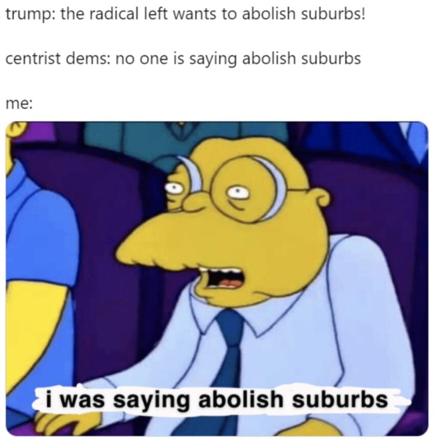 Si sos una persona más seria que yo quizás no te acuerdes del capítulo de Los Simpsons al que hace referencia el tweet que originó el meme, así que te lo dejo por acá. En fin, todo esto para introducir uno de los temas de hoy: elecciones en Estados Unidos y los suburbios.