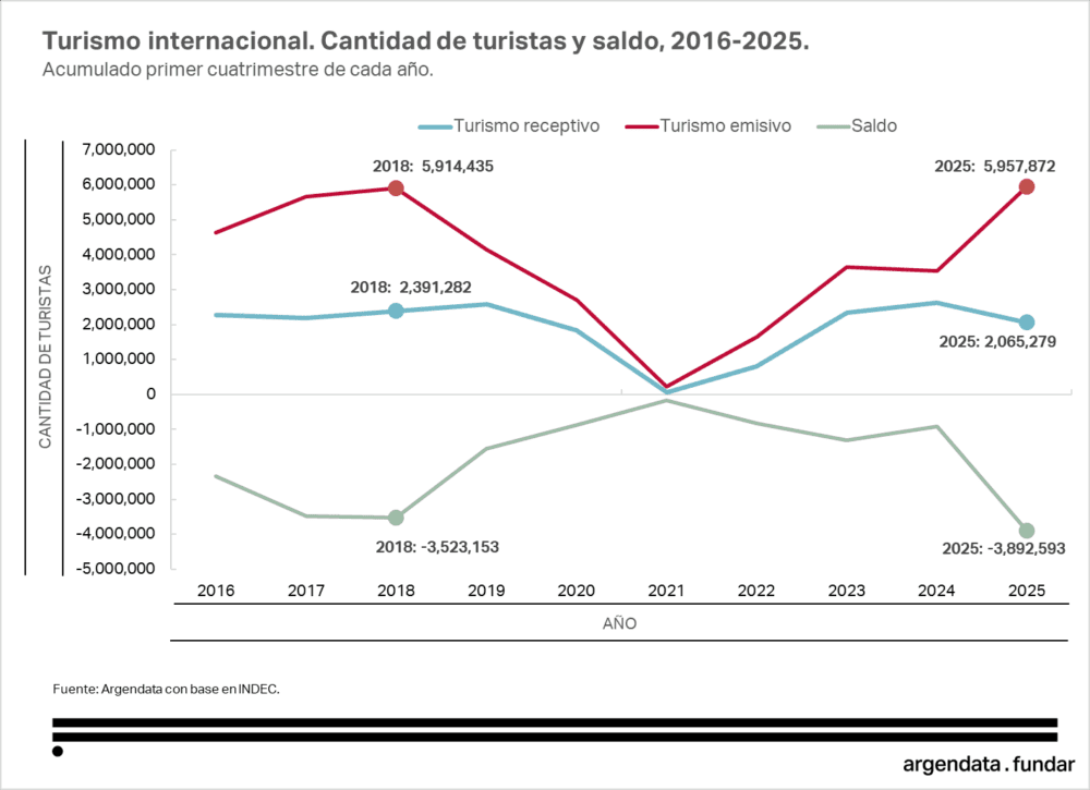Los datos son incontrovertibles. “En el primer cuatrimestre del año, casi 6 millones de personas viajaron al exterior, una cifra histórica, mientras que solo ingresaron al país 2 millones de turistas, el número más bajo de la última década si se excluyen los años de pandemia”, explicó Daniel Schteingart, director de Planificación Productiva de Fundar.