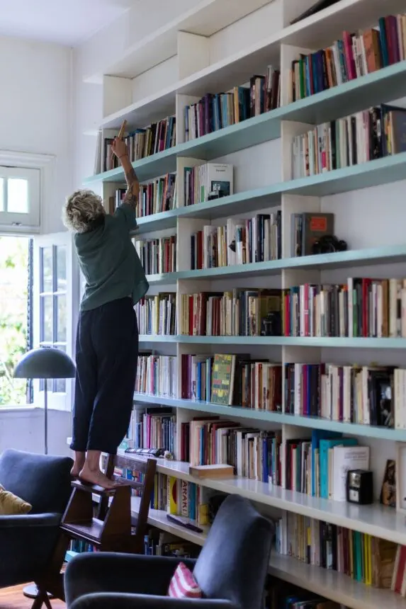 Nos levantamos de los sillones y nos acercamos a los estantes para conversar puntualmente de algunos libros. Se nota que la suya es una biblioteca bien depurada, no solo por el orden, sino también por la selección. Los libros que están ahí claramente fueron leídos, cumplen un rol. Es una biblioteca activa. Muchos de ellos están bastante altos, así que Albertina despliega el mobiliario para la ocasión: una silla que se convierte en escalera, o una escalera que se convierte en silla. “Copié el modelo que estaba en lo de mi abuela y me la hizo una carpintera. No se consiguen de estos muebles a los que se les sale el escaloncito”, cuenta.
