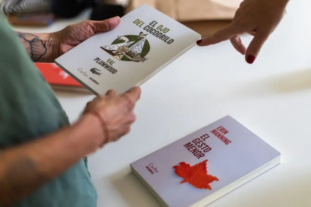 –Como siempre hago en estas notas, te traje unos libros de regalo para que se queden en tus estantes. Son de la editorial Cactus. El ojo del cocodrilo es de una filósofa feminista australiana que se salvó de un ataque de este animal y escribió un libro sobre su experiencia. Y El gesto menor es de una teórica canadiense que viene de la tradición deleuziana y escribe sobre la naturaleza de lo incipiente y lo precario.