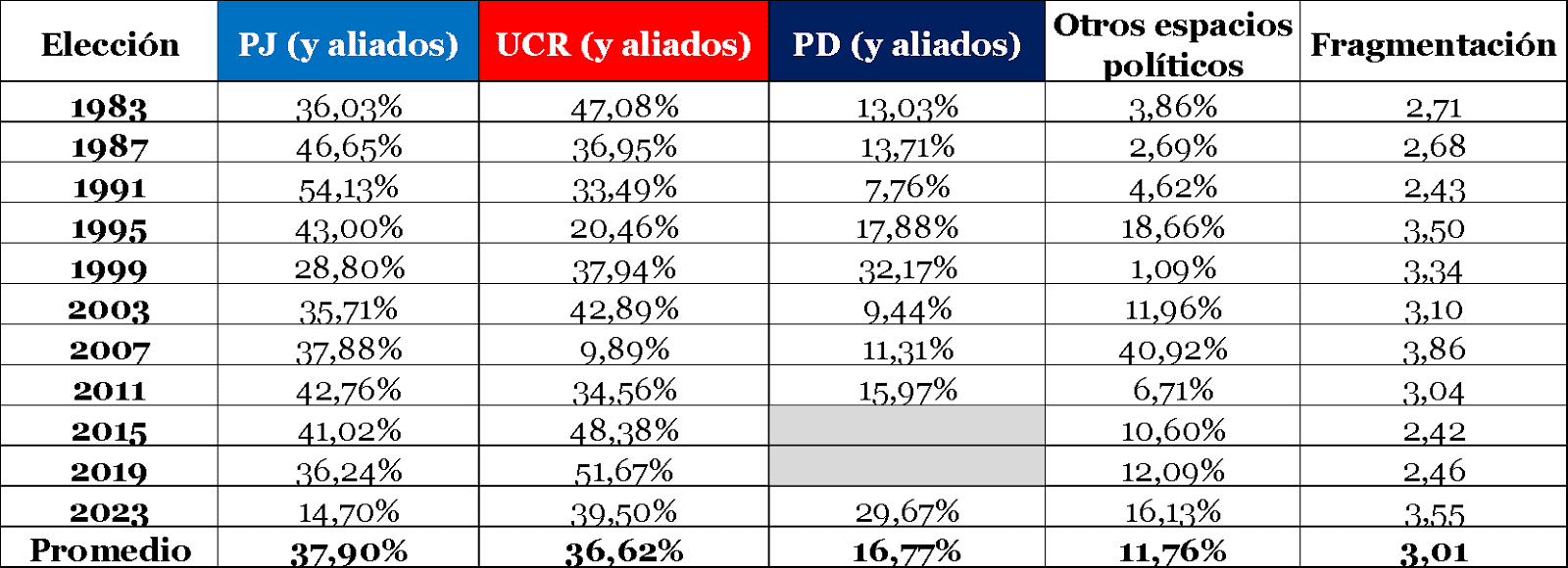 Fuente: elaboración propia en base a de escrutinios definitivos y del escrutinio provisorio de 2023. Fragmentación se mide a partir del número efectivo de partidos, que calcula cuántos espacios políticos son competitivos a partir de la proporción de votos que obtiene cada uno. En 2007 “otros espacios políticos” cuenta los votos de la Concertación que llevó la fórmula Biffi-Thomas y que estaba asociada a Julio César Cleto Cobos. Los votos de UCR corresponden a la fórmula Iglesias-Sanz.