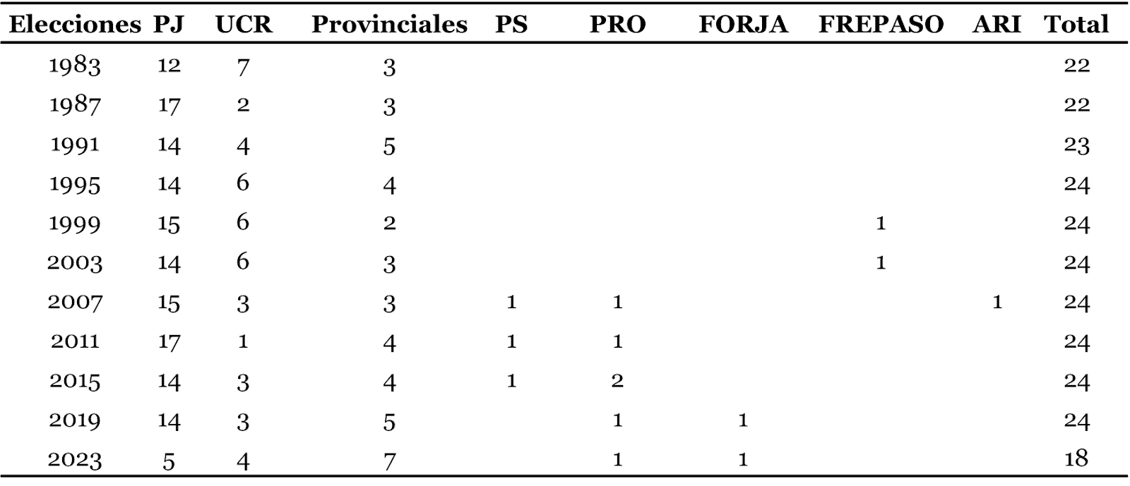 La segunda tabla es histórica y te muestra la proporción de votos que sacaron los principales espacios políticos de la provincia desde el retorno a la democracia hasta este año. Tiene las etiquetas tradicionales con sus colores históricos (Cambia Mendoza adoptó el violeta) y asume que en algunas elecciones armaron coaliciones para competir. La última columna muestra el valor de fragmentación partidaria a partir de la proporción de votos obtenidos por todas las fuerzas que compitieron.