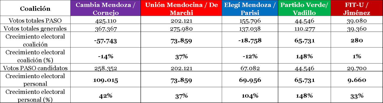 ¿Qué estoy viendo? Que hubo crecimiento personal de todos los candidatos que pasaron el filtro, tal como te muestran las últimas dos filas de la tabla. Tanto Cornejo como Omar De Marchi subieron en proporciones similares, al igual que Lautaro Jiménez (FIT-U). En términos nominales, hubo diferencias, claro. Los que capitalizaron una mayor ganancia fueron Omar Parisi (PJ) y Mario Vadillo (Partido Verde), quien creo que fue la sorpresa de la elección. Si la volvés a ver, por ahí llegas a la misma conclusión que yo.