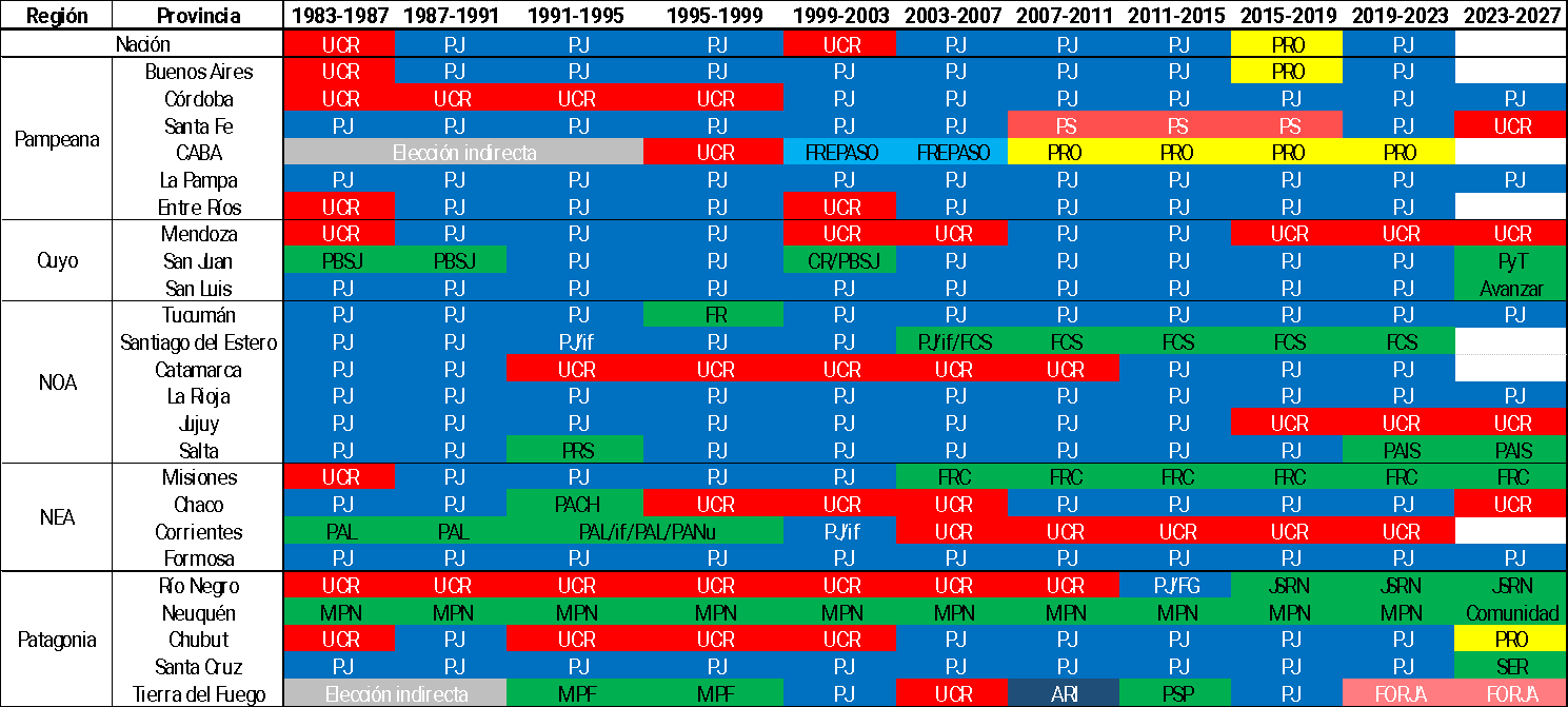 Esa tabla muestra el partido de cada uno de los gobernadores y las (pocas) gobernadoras que se sentaron en los sillones provinciales. El azul es el clásico color del peronismo, en cualquiera de sus formas. El rojo, el de los radicales. Los otros colores indican aquellos partidos nacionales que ganaron en esos distritos: amarillo el PRO, rojizo más claro el Partido Socialista, uno parecido FORJA, celeste el FREPASO y el ARI en azul más tirando a violeta. La homogeneidad cromática es el verde, que representa a los partidos provinciales. Son todas aquellas fuerzas político-partidarias que tienen representación en ese distrito y no buscaron extenderse a otros territorios. Algunas son siglas, otras el nombre completo. Economía de espacios en Excel.