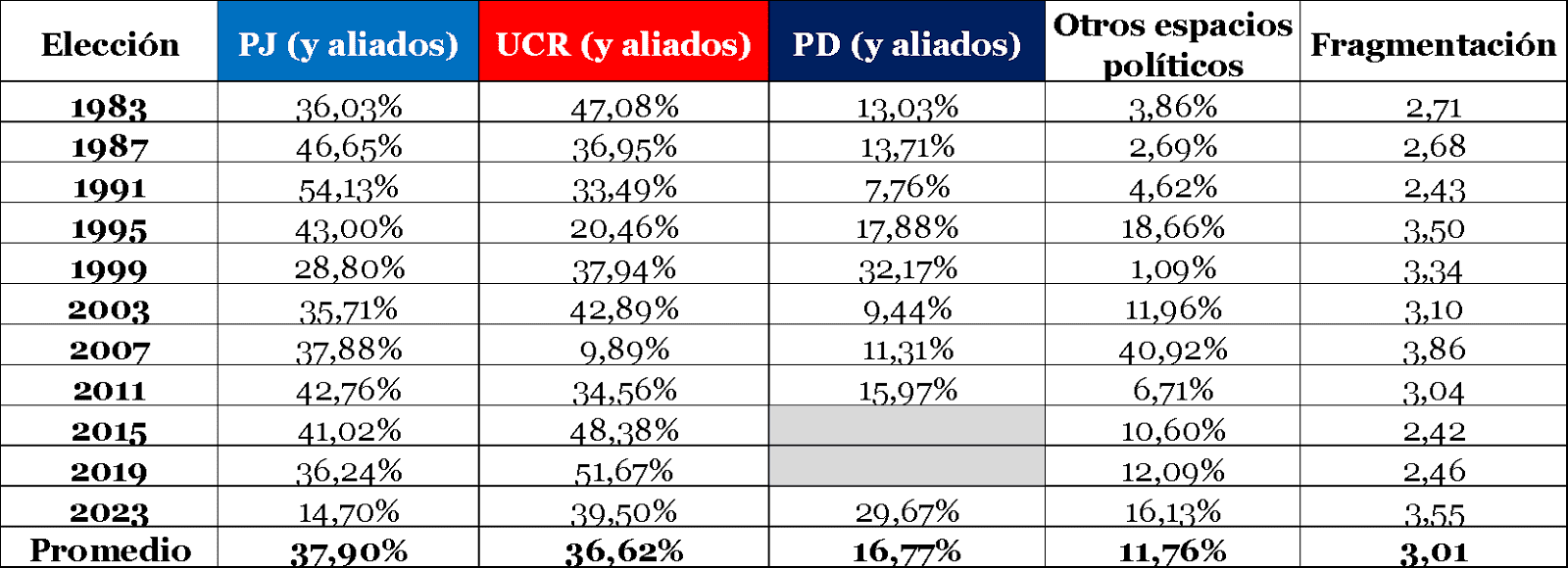 Fuente: elaboración propia en base a de escrutinios definitivos y del escrutinio provisorio de 2023. Fragmentación se mide a partir del número efectivo de partidos, que calcula cuántos espacios políticos son competitivos a partir de la proporción de votos que obtiene cada uno. En 2007 “otros espacios políticos” cuenta los votos de la Concertación que llevó la fórmula Biffi-Thomas y que estaba asociada a Julio César Cleto Cobos. Los votos de UCR corresponden a la fórmula Iglesias-Sanz.