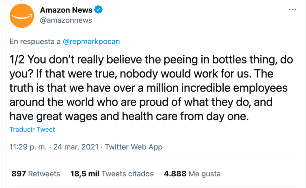 El grupo por el que la empresa ha recibido más cuestionamientos es el segundo: los trabajadores de sus almacenes. ¿Qué dice Amazon al respecto? Dos cosas. Una, que las condiciones no son así de duras porque, si fuera así, nadie querría trabajar para ellos. Esto no me lo invento, sino que es literalmente lo que un CM de Amazon tuiteó en respuesta a un político demócrata que los acusaba por el tema del pis en las botellas.