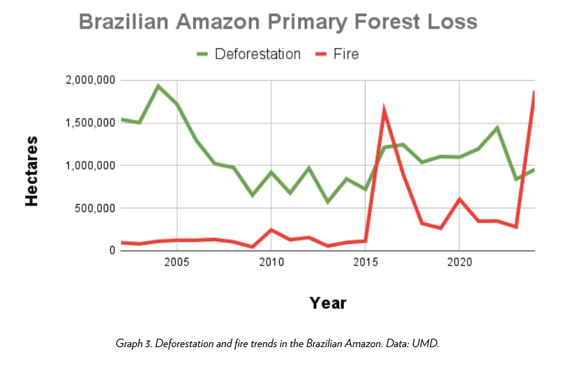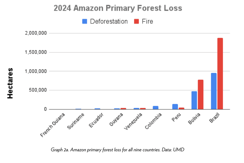 ¿Pero qué hay del Amazonas? Las noticias son más escasas, pero los datos son igual de catastróficos. Según el último informe del Monitoring of the Andes Program (MAAP), en 2024 se perdieron 4.5 millones de hectáreas (o sea poco más de dos Gales enteros) entre los 9 países que contienen al Amazonas. Brasil se lleva el podio por lejos: casi 1 millones de hectáreas de pérdida debido a deforestación primaria y casi 2 millones de pérdida de bosque debido a incendios.