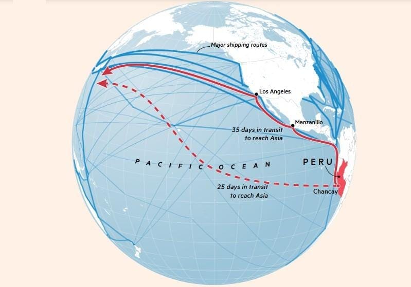 “Le estamos brindando a nuestros socios latinoamericanos una puerta de conexión en ambos sentidos con la región más dinámica del mundo, el Asia-Pacífico”, enfatizó Boluarte, haciendo hincapié en la búsqueda de ser un hub a mediano plazo. Este punto le da mayor centralidad a la inauguración: hasta ahora los barcos de más de 50 mil toneladas no llegaban a América del Sur, debiendo hacer transbordos en embarcaciones más pequeñas desde Los Angeles (USA) o Manzanilla (México). El ahorro en tiempo y fletes sería importante: de acuerdo a las proyecciones Chancay reduciría en promedio diez días el viaje a Asia, bajándolo de 35 a 25 días. En el spot oficial, con música épica, los trabajadores del megapuerto repiten la frase: de Chancay a Shangai.