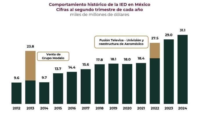 “Lo digo con toda claridad: tengan la certeza de que las inversiones de accionistas de nacionales y extranjeros estarán seguras en nuestro país”, dijo Sheinbaum durante su asunción. En el México de AMLO ganaron los pobres, pero también los más acaudalados. Durante los primeros seis meses de 2024, se recibieron más de 36 mil millones de dólares de Inversión Extranjera Directa (IED), logrando un nuevo récord de acuerdo a lo informado por la Secretaría de Economía. Estados Unidos se mantiene como el principal inversor, con 44% del flujo total, seguido por Alemania, Japón, Canadá, Bélgica y Argentina.