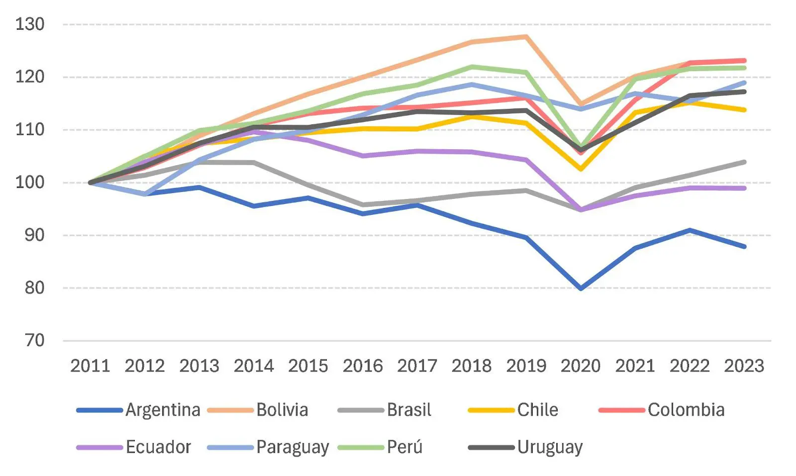 Al comparar con el resto de la región, el atraso se hace evidente. La gran mayoría de los países aumentaron su PBI per cápita de manera significativa: Colombia y Bolivia 23%, Perú 22%, Paraguay 19%, Uruguay 17% y Chile 14%. Le siguen dos casos intermedios (Brasil con 4% y Ecuador -1%) y bastante más lejos Argentina con una caída del 12%. En el gráfico no se incluye el caso venezolano -que sin dudas se ubica por debajo del argentino- por falta de datos oficiales.
