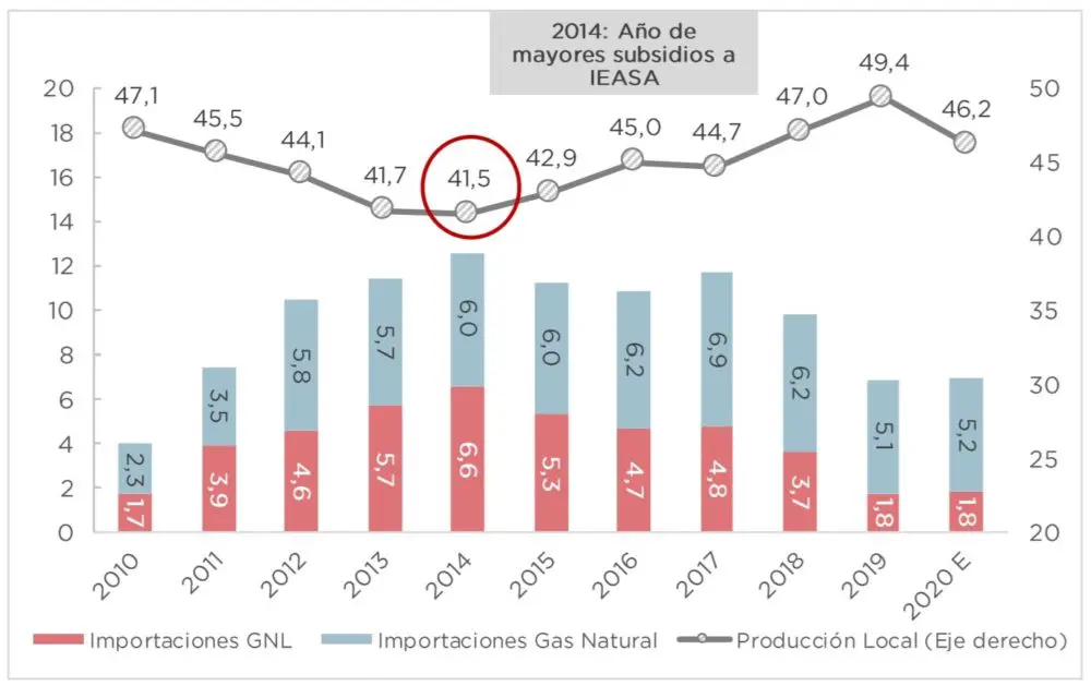 Sumado a lo anterior, existe un problema adicional que es el desincentivo a la producción y a las inversiones en el sector, que derivan en un aumento de las importaciones de energía. Como señala este trabajo realizado en 2020 por la Oficina de Presupuesto del Congreso: “La decisión de mantener prácticamente congeladas las tarifas luego de la devaluación de 2002 generó una caída de la producción y un incremento en la cantidad de importaciones, tanto de gas natural como licuado, con un máximo registrado en el año 2014”. Es ese, precisamente, el año de mayores subsidios a la empresa Integración Energética Argentina S.A. (IEASA).