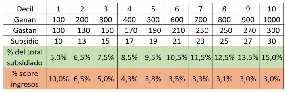 Pongamos un ejemplo hipotético para que se entienda mejor. Imaginemos que tenemos 10 personas, ordenadas según su ingreso de menor a mayor (de esa manera, cada persona representa a 1 decil), y que les otorgamos un 10% de subsidio en función de lo que consumen (parecido a como funciona con las tarifas en la realidad).