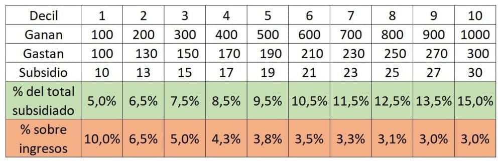 Pongamos un ejemplo hipotético para que se entienda mejor. Imaginemos que tenemos 10 personas, ordenadas según su ingreso de menor a mayor (de esa manera, cada persona representa a 1 decil), y que les otorgamos un 10% de subsidio en función de lo que consumen (parecido a como funciona con las tarifas en la realidad).