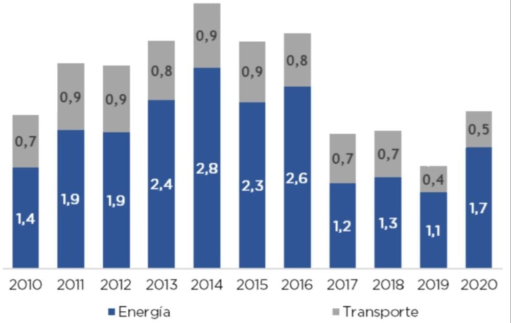 La contrapartida del congelamiento de las tarifas es el incremento de los subsidios energéticos (que es lo que permite desacoplar el monto que paga el consumidor de los costos de generación y transporte), con lo cual esto lleva al incremento del gasto público. Como se desprende del gráfico, en 2020 se vio una expansión en este rubro, impulsado casi en su totalidad por los subsidios energéticos (aquellos vinculados al transporte públicos se mantuvieron en un nivel similar al de 2019).