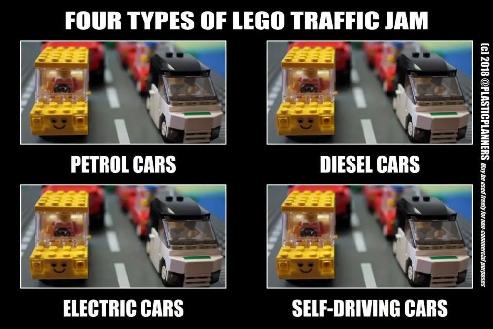 Traduzco: “Cuatro tipos de embotellamiento lego: i) autos a petróleo, ii) autos a diésel, iii) autos eléctricos, iv) autos autónomos”.