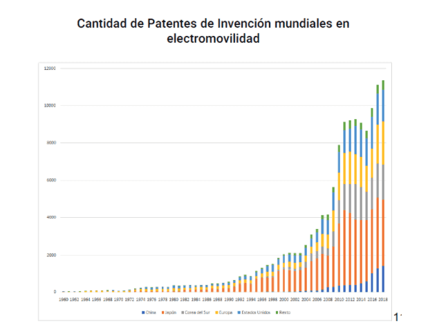 Este crecimiento del sector de los vehículos eléctricos, requiere de importantes innovaciones tecnológicas. En este gráfico que compartió el Ministerio de Desarrollo Productivo vemos que las patentes en electromovilidad vienen creciendo enormemente y con un fuerte liderazgo japonés. No por casualidad la presentación se hizo en Toyota.
