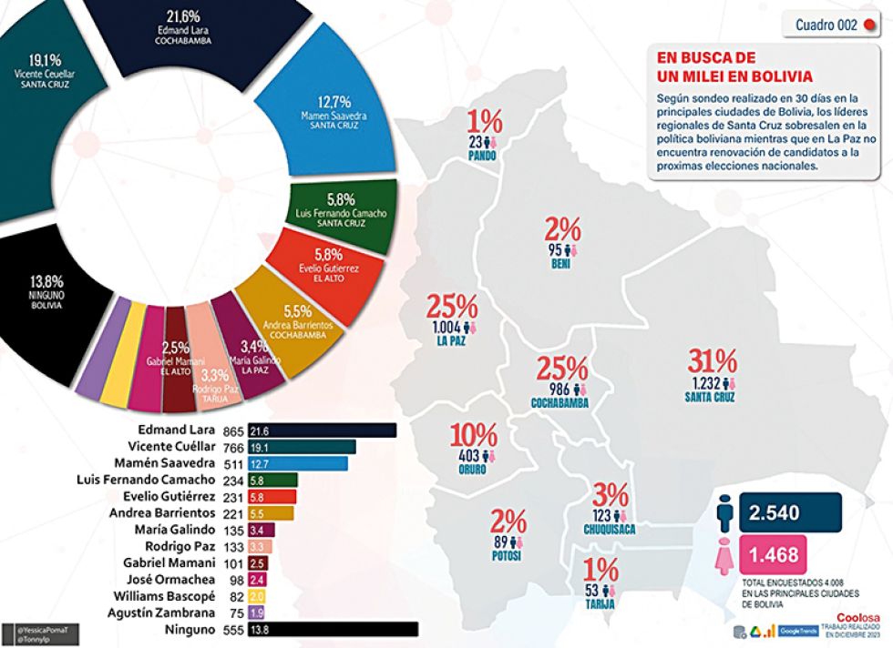 En 2023, tras el triunfo de Javier Milei en Argentina, una empresa de servicios digitales llamada Coolosa le preguntó a más de 4 mil personas quién podría ser un Milei boliviano. Lara ganó aquella votación con 21.6%, por sobre otras figuras como Luis Fernando Camacho y María Galindo. Otra curiosidad adicional es que también figura en ese sondeo, aunque más relegado, el propio candidato a presidente, Rodrigo Paz Pereira.