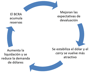 La explicación radica en que el propio carry hoy es un factor clave en la estabilidad cambiaria, tanto del dólar oficial como del financiero. Y esto es porque, como el dólar está estable (y se espera que siga estable), todos los jugadores del mercado razonan de la misma manera: lo que conviene es posicionarse en activos en pesos y no en dólares, lo que lleva a una mayor oferta de dólares en el mercado y a una menor demanda, lo que le permite al Banco Central acumular reservas, reforzando su estabilidad e incentivando –todavía más- el carry.