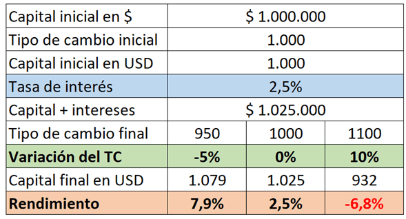 Veamos un ejemplo para entender de qué se trata y para identificar las distintas partes que hacen a esta estrategia. Supongamos que tengo un capital inicial de $1 millón y que el tipo de cambio de ese día es de 1.000 $/USD (con lo cual, mi capital valuado en dólares sería de 1.000). Lo pongo en un plazo fijo a 30 días, que actualmente está ofreciendo una tasa de alrededor del 2,5%. Vencido el plazo, el banco me devuelve $1.025.000 (el capital más los intereses). Fíjense que, si pasados los 30 días, el tipo de cambio se mantuvo estable en 1.000 $/USD, entonces obtuve un rendimiento del 2,5% también en dólares (porque ahora con los pesos que tengo podría comprar USD 1.025). Ahora si, por ejemplo, el tipo de cambio baja a 950, entonces mi ganancia hubiera sido del 7,9% (podría comprar USD 1.079). Pero si, en cambio, el tipo de cambio sube hasta 1.100 ahí tendría una pérdida del 6,8% (podría comprar sólo USD 932).