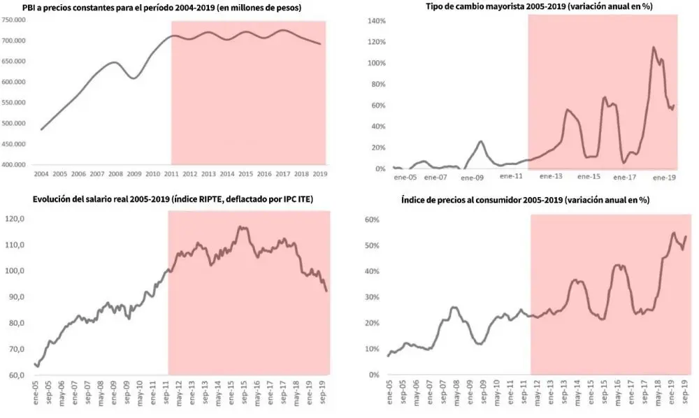 La actividad económica se encuentra estancada desde hace casi 10 años. Como vimos acá, eso es un gran problema, ya que las condiciones de vida de la población están atadas al (no) crecimiento económico argentino. ¿Por qué sucede esto? Porque la economía se encuentra atrapada en un círculo vicioso conocido como stop and go, un término acuñado en los ’60 (vaya si no es cíclica nuestra historia económica). Como muestra el gráfico (verlo en sentido horario), desde 2011 se suceden períodos de recesión -provocados por devaluaciones del tipo de cambio que impulsan al alza los precios, reduciendo el poder adquisitivo y la demanda agregada- seguidos de períodos de recuperación (donde se revierte el comportamiento de las variables mencionadas).
