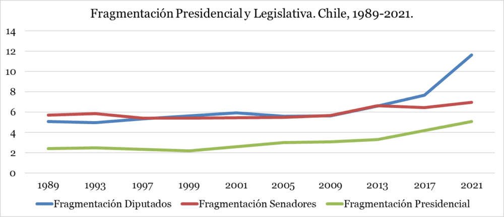 Fuente: elaboración propia en base a Wikipedia y Servel. Las elecciones presidenciales que miden la fragmentación para esa categoría se celebraron en todos los años indicados, menos 1997 y 2001. Las legislativas igual, salvo 1999. Eso se debe a que el mandato de los/as legisladores/as y de la Presidencia estaban desfasados hasta las elecciones del 2005.