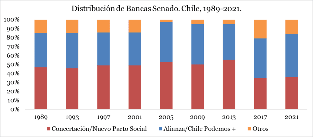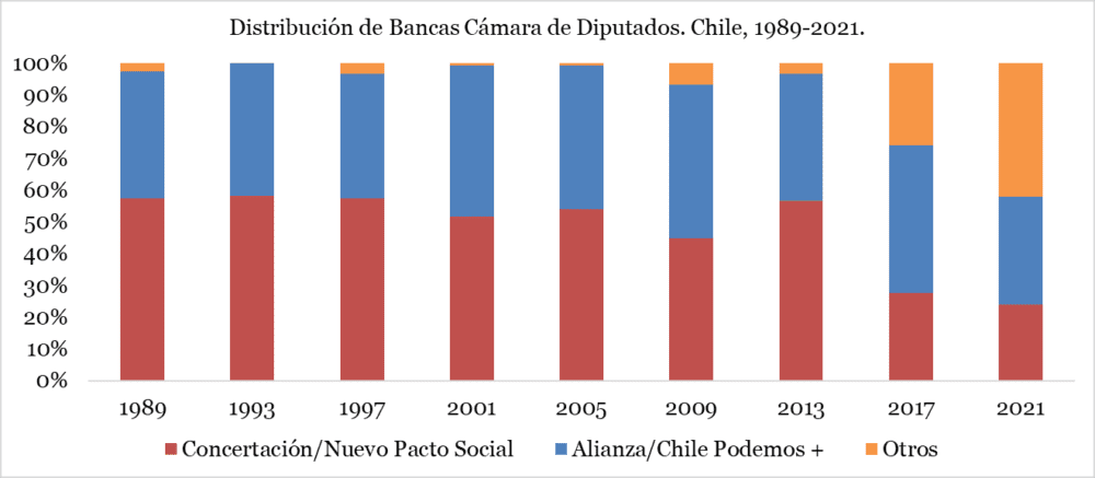 1. El Congreso es una buena foto del cambio. Lo primero que quiero resaltar es el balance de fuerzas entre los actores más tradicionales y los nuevos que vienen irrumpiendo en las dos últimas elecciones. Para refrescarte la memoria, la política chilena estuvo dominada desde 1989 por una coalición de centroizquierda, la Concertación (hoy Nuevo Pacto Social), y otra coalición de centroderecha, la Alianza (hoy Chile Podemos +). Pero a partir del cambio de reglas en 2017 eso dejó de ser tan así. En los próximos dos gráficos vas a ver por qué.