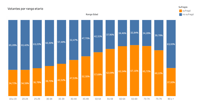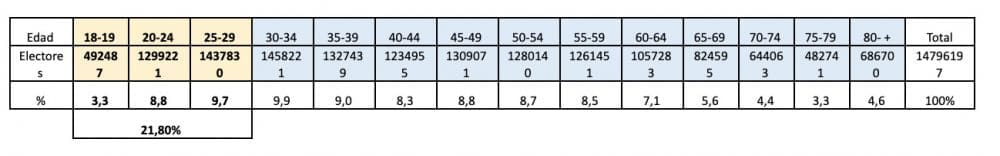El segundo elemento por considerar en el ítem participación son los votantes del segmento joven, caracterizando este grupo como aquellos cuya edad oscila entre 18 a 29 años, siendo un total de 3.229.538 electores que representan un 21,8% del padrón (Figura 2). La participación de esta franja etaria en los últimos años ha sido exigua, muy en contraposición a la participación protagónica juvenil en la protesta social iniciada el 18-O del 2019, tal como caracteriza el Núcleo de Sociología contingente de la Facultad de Ciencias Sociales de la U. de Chile.