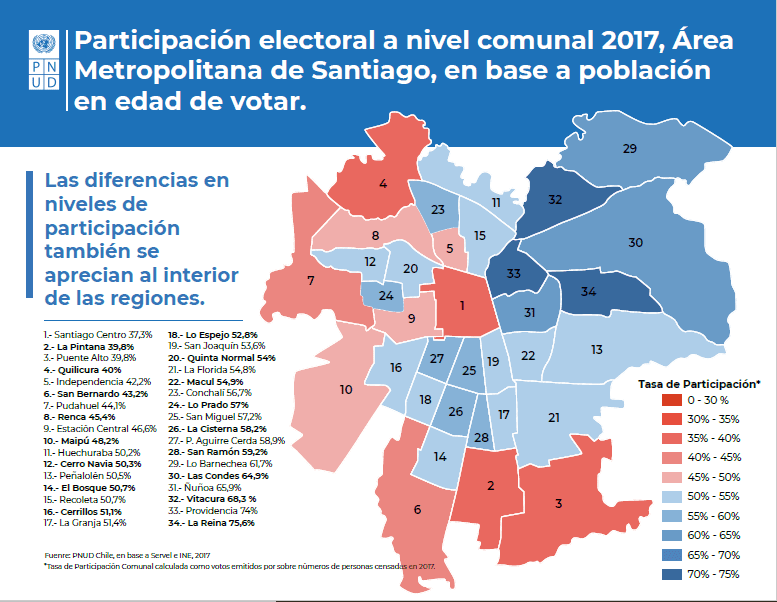 La participación de las comunas periféricas es muy baja en relación con las comunas más ricas del país. Tomando en consideración la realidad de la Región Metropolitana respecto a la última elección presidencial la comuna más pobre –La Pintana– tiene una participación del 37%, versus un 73% de Vitacura, la comuna más rica de Santiago, en una relación de 1:2.