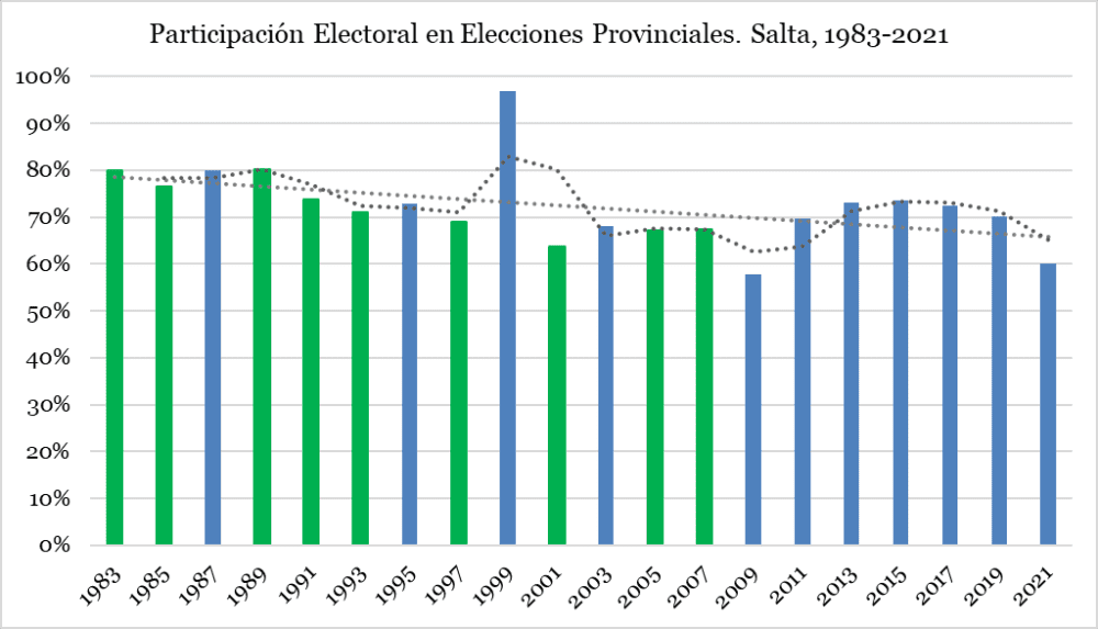 - Ya sabés que hubo elecciones provinciales en Salta y que, otra vez, la participación electoral fue un tema: votó el 60,20% de los electores, lo que implica una caída de 12 puntos respecto del promedio desde 1983 hasta la fecha. Eso, considerando elecciones concurrentes con las nacionales (barras verdes) o separadas de ellas (barras azules). Acá te dejo el gráfico de la evolución (con tendencia lineal -gris- y promedio cada dos elecciones -gris oscuro-) y algo cortito que saqué por Twitter.
