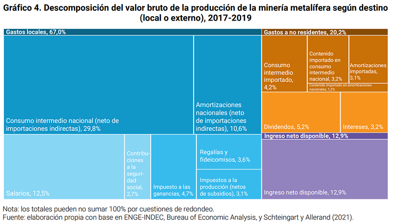 Hay quienes dicen que de esas inversiones poco queda en el país, sin embargo, según un informe del CEP XXI, al analizar la actividad minera se encuentra que el 80% de las ganancias por ventas queda en el país, ya sea en gastos para llevar adelante las actividades -en otra entrega vamos a hablar exclusivamente de los proveedores locales-, como en salarios e impuestos. Te dejo este gráfico que detalla bien los gastos de estas empresas.