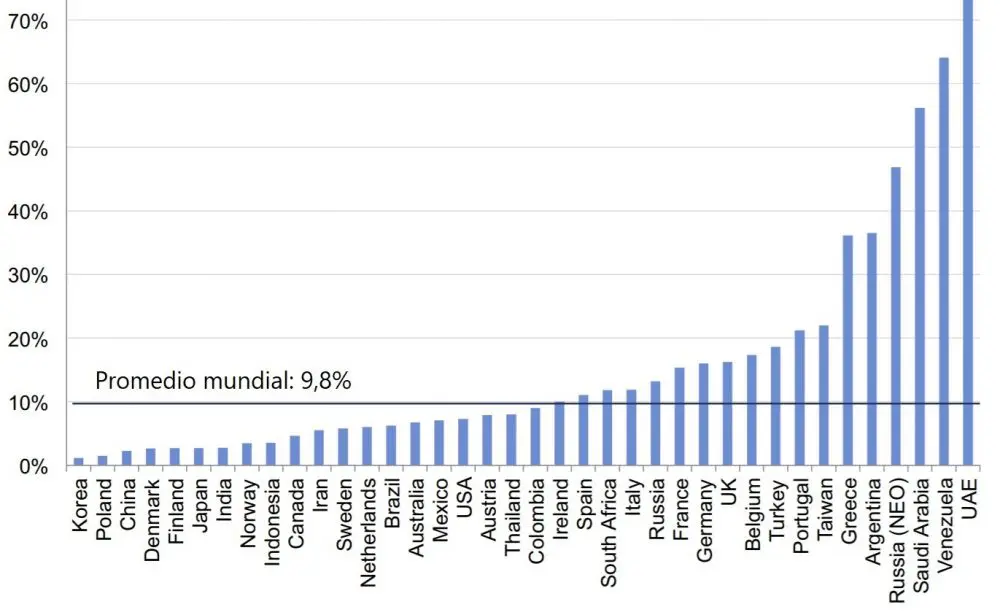 Por otro lado, la comparación internacional muestra que, una vez más, somos un caso atípico. En este trabajo, Alstadsæter, Johannesen y Zucman armaron una base de datos donde relevan la riqueza “offshore” ubicada en los distintos paraísos fiscales bancarios (que paulatinamente se fueron divulgado por la presión global o directamente por filtraciones informativas, como el caso de los “Panamá papers”), distinguiendo por la residencia de dichos capitales. De esa base se desprende que Argentina es el quinto país con mayor riqueza acumulada en paraísos fiscales (en relación al tamaño de su economía), con un 38%, que es además muy por encima de la media mundial.