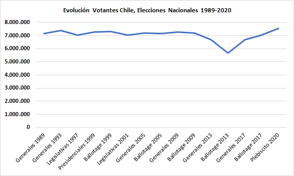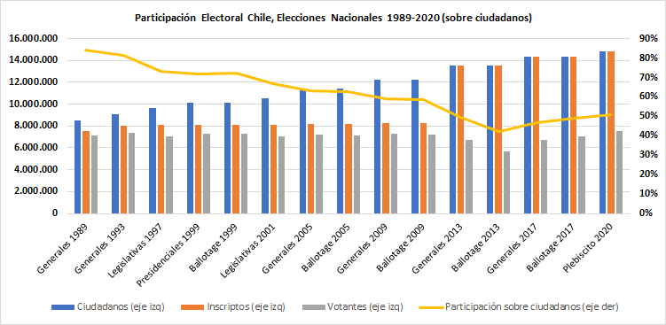 Ahora bien, la cara dulce de la moneda muestra que el resultado del plebiscito constitucional fue positivo en términos de participación electoral. En el gráfico a continuación se puede ver como la cantidad de votantes que concurrieron a expresar el apoyo o el rechazo es el más alto desde el retorno a la democracia. Incluso más que en las elecciones generales de 1993, las segundas celebradas. Esta cara fortalece aún más la euforia al continuar el repunte de la participación que se inició a partir de las elecciones 2017, las segundas después de la reforma del sistema de votación.