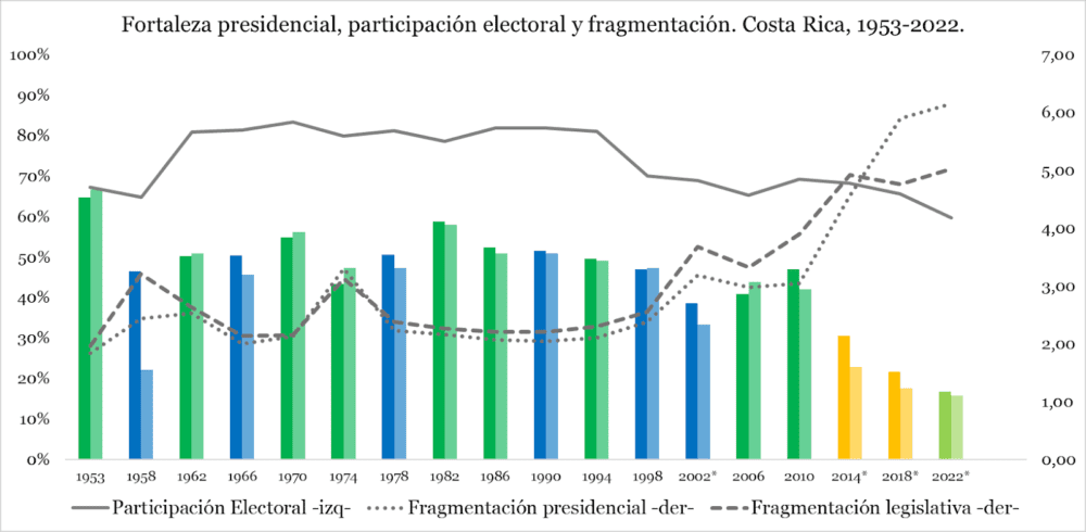 Fuente: elaboración propia en base a Wikipedia. Las columnas indican el % de voto obtenido en la categoría presidencial en primera vuelta (color más oscuro) y el % de bancas de la legislatura unicameral que logró cada presidente electo (color más claro). Ambas se leen con el eje vertical de la izquierda. Verde = PLN. Azul = calderonismo/PUSC. Amarillo = PAC. Verde más claro = PSD. Los colores definidos son los utilizados públicamente por cada partido en la campaña. Fragmentación = Número Efectivo de Partidos (NEP). * = indica años en que se celebró ballotage.