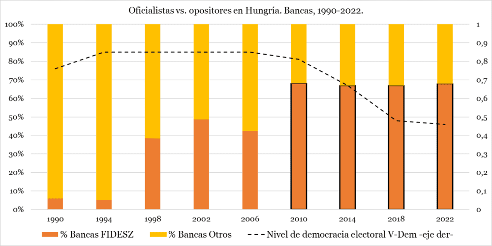 Fuente: elaboración propia en base a Wikipedia. Otros agrupa a todos los rivales de Fidesz. Las columnas resaltadas con bordes negros son los años en que gobernó Orbán.