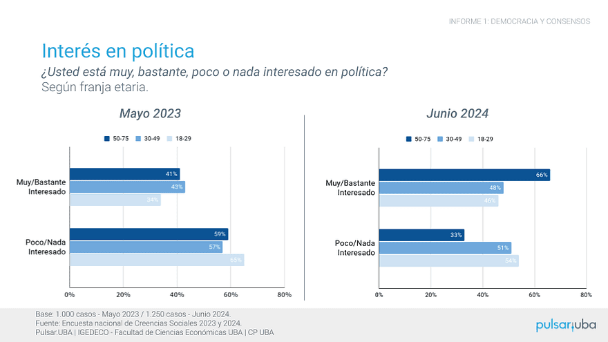 Si vos estás viendo lo mismo que yo, el cambio fuerte vino por el lado de los adultos mayores. De un año a otro el aumento del interés en la política pasó del 41% al 66% en este segmento. A eso se sumó también un salto entre los jóvenes, entre quienes subió del 34% al 46%. Este último grupo, igualmente, sigue siendo el más desinteresado de los tres, dado que hay un 54% mayoritario que sigue respondiendo “poco” o “nada interesado” en política. Ay los jóvenes.