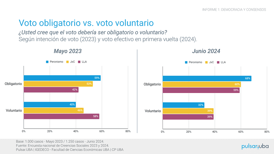 Por eso el cambio que muestra la encuesta de Creencias Sociales es una buena noticia. En términos generales, el apoyo al voto obligatorio pasó del 54% en 2023 al 62% en este 2024. La opción por el optativo, en cambio, cayó del 45% del año pasado al 37% de este. Esto quiere decir que, hoy en día, casi 2 de cada 3 consultados bancan la obligatoriedad. Hermoso dato.