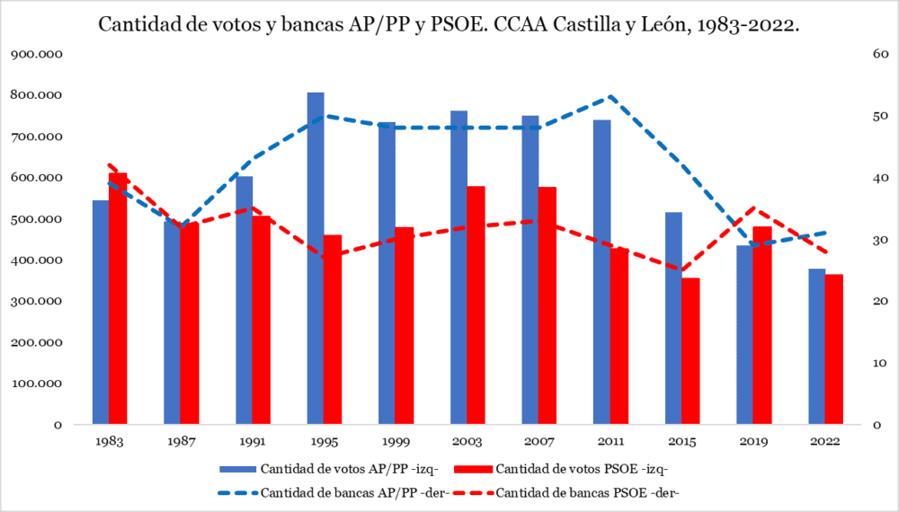 A eso se suma que el PP regional logró el registro más bajo de votos en su historia, con el 31,43%. Acá te dejo para que veas la evolución de los dos principales partidos en Castilla y León.
