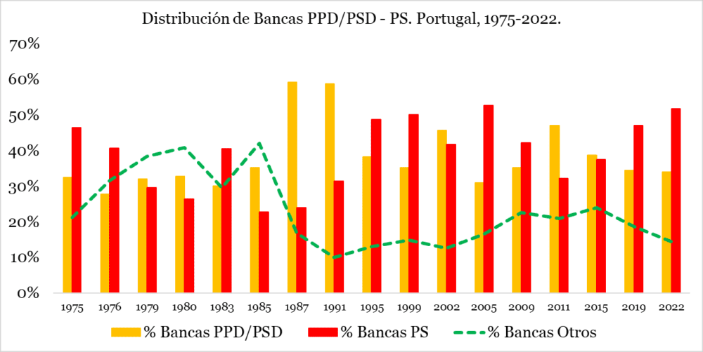 De esta manera, y tal como ves en el gráfico, Costa sostiene la senda alcista del PS portugués desde que agarró la batuta del partido en 2014 como Secretario General y el gobierno en 2015 como Primer Ministro. Desde el retorno a la democracia en 1975 con la convocatoria a la Asamblea Constituyente después de la Revolución de los Claveles que el socialismo no sacaba un porcentaje tan alto de bancas. El PSD, que se llamaba Partido Popular Democrático/PSD en su fundación en 1974 y cambó a su actual nombre en 1977, no sacaba porcentajes tan bajos desde el período 1979/1980 cuando competía bajo la Alianza Democrática junto al Centro Democrático Social-Partido Popular (CDS-PP) y el Partido Popular Monárquico (PPM). Ambos partidos ayudaron al histórico y carismático líder del PSD, Francisco Sá Carneiro, a ganar y gobernar. De ahí que la línea “Otros” ronde el 40% de las bancas en esos años. Después, como ves, todo se normalizó en torno a una bipolaridad PS vs. PSD.