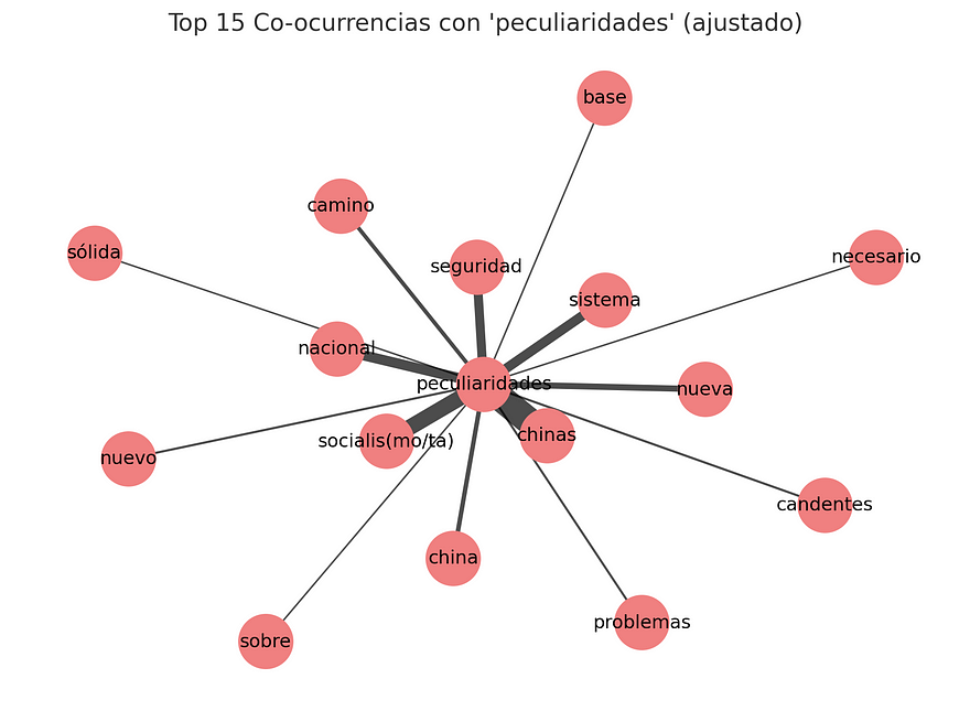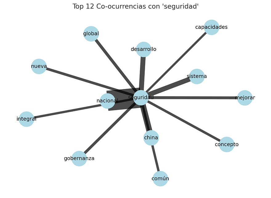 Para entender mejor esta arquitectura discursiva, realicé un análisis de co-ocurrencias: una herramienta que detecta qué palabras aparecen juntas con frecuencia. Usé una ventana de cinco palabras. El ancho de las líneas refleja la frecuencia de cada co-ocurrencia. El resultado confirma lo obvio (la palabra “seguridad” se casa felizmente con “nacional”) pero también revela un vínculo estrecho con “desarrollo”. La seguridad, aquí, no es la ausencia de guerra, sino la precondición del progreso.