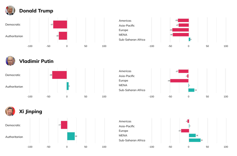 Esta diferencia de enfoques se refleja en la percepción pública. Según el Democracy Perception Index 2025 de NIRA, por primera vez más países tienen una visión positiva de China (+14%) que de Estados Unidos (-5%), una caída abrupta desde el +22% que tenía en 2024. Y cuando se mide a los líderes, Trump es el político con peor imagen global: un 82% de los países le dan un saldo neto negativo, muy por debajo incluso de Putin (61%) y Xi (44%).