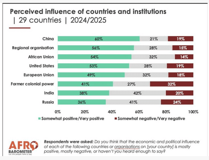 Una encuesta del AfroBarometer muestra que China tiene la mejor imagen positiva si la comparamos con Estados Unidos, la Unión Europea, Rusia e incluso la Unión Africana.