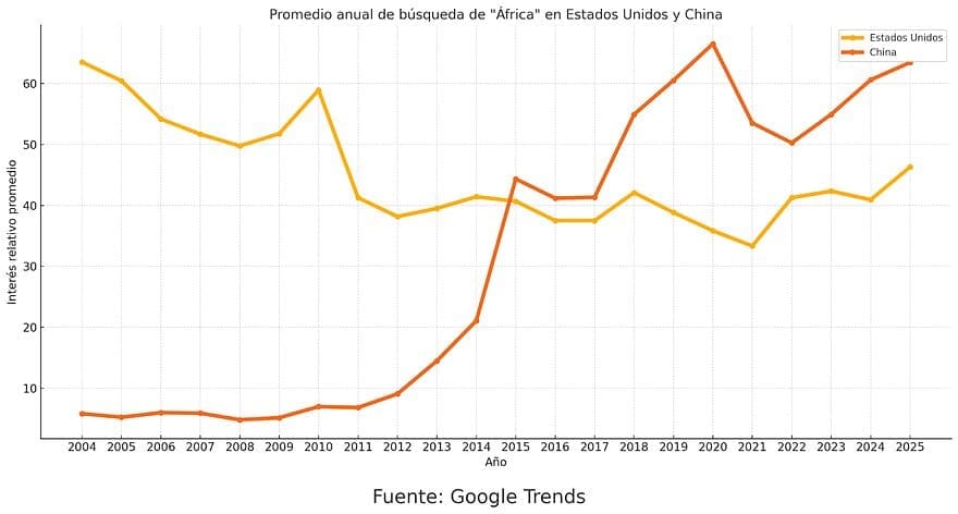 En el gráfico de abajo, busqué los datos de Google Trends para búsquedas online de “África” en Estados Unidos y China. La tendencia no sorprende, pero no deja de ser ilustrativa.