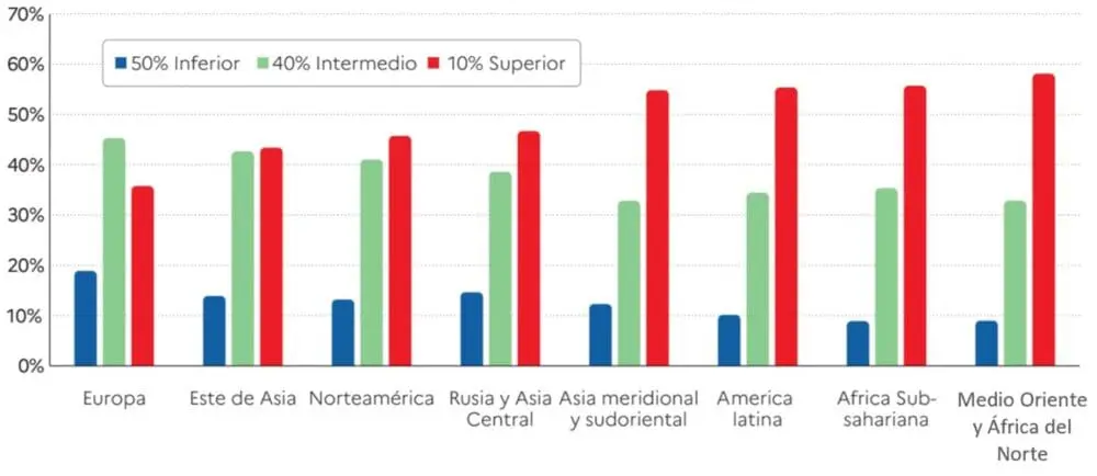 El segundo hecho estilizado es que este mismo patrón (la existencia de una inequidad en la distribución) se repite cuando miramos hacia adentro de cada país o región, como refleja el gráfico a continuación. Pero acá aparece un dato interesante: no todas las regiones son igual de inequitativas, como queda claro al comparar Europa con el resto.