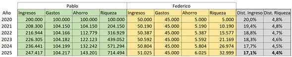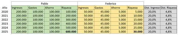 Como muestran las últimas dos columnas, esto lleva a una distribución del ingreso y de la riqueza muy inequitativa pero estable en el tiempo. Es decir, todos los años, Federico se apropia del 20% del total de los ingresos que genera esta economía y del 4,8% de la riqueza, mientras que Pablo se queda con la parte restante.